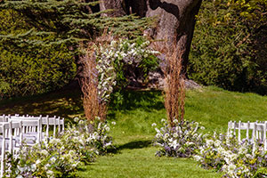 Less is more – find a romantic spot such as a large tree or next to a lake or garden to have an outdoor ceremony. Add a touch of nature with an arch made from twisted willow with asymmetric flowers in your chosen colour scheme. Add some floral displays using the same flowers to the base of your arch and down your aisle.