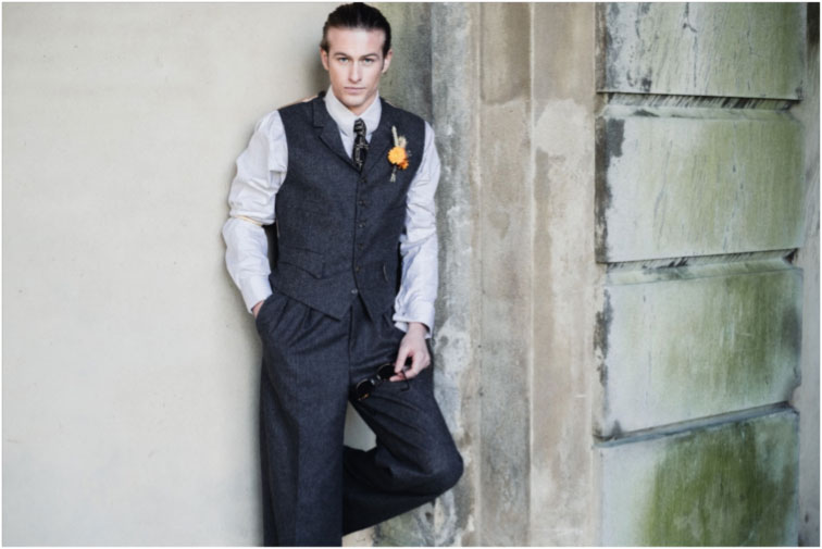 Having a rustic, country wedding? Then ditch the jacket and choose a grey herringbone suit with the classic 1920s Peaky Blinder hat. Instead of a usual button hole, go for some dried flowers for that extra rustic charm.