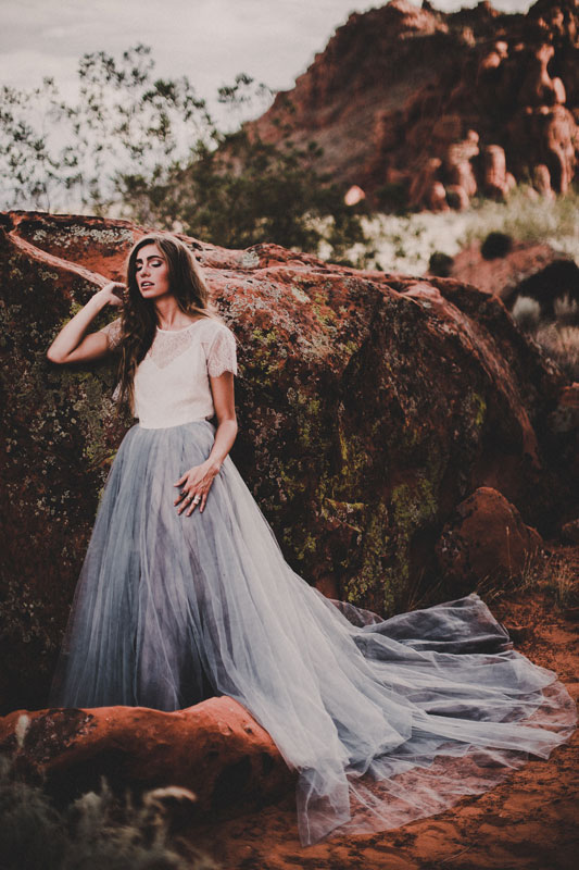 The handmade Mae dress by Chantel Lauren has a silk bodice with a delicate lace jacket and hand painted silk underskirt with a steel blue tulle overlay. It is such a dramatic dress, perfect for a destination wedding.