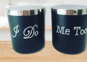 At £70 per pair, the matching candles are a substantial size – in 30cl matt black candle glass. In diamante lettering, one says "I do", and the other "me too".