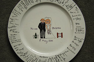 Signature plates are popular making functional “Guest comment books”. This is when the guests at the wedding sign their personal message to the Bride and Groom onto the plate. The plate can also have a personalised design appropriate to the wedding couple. You take the guest signature plate blank to the event, your guests sign with one of our pencils and then you bring the plate back to us, for us to paint the centre design on and paint the signatures in. The plate can be used as normal or hung up on your wall and the messages are there for ever. These signature plates are normally created on a 40cm diameter plate and therefore need to be collected direct from our studio.