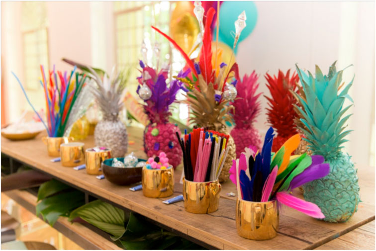 Keep to a palette of similar pinks at the party and elevate this with glamorous gold decorations like Letteroom’s joyous ‘Let’s Flamingle’ banner. Make it playful and on-trend with a healthy helping of glitter, confetti and tropical brights. From fruity decor to fun (but stylish) partyware, these original delights will set the mood for the celebrations.