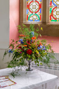 When using lots of colour, keep your table décor simple. Line long tables with small terracotta pots filled with a combination of flowers such as roses, callistephus, carnations, gerbera, delphiniums, crysanths, snapdragons and dahlias for colourful table displays. Add some lighting by placing some brass candlesticks and jewel coloured Moroccan glasses to hold tea lights amongst your displays. Finish the look by adding autumn fruits and berries, including strawberries, raspberries, blackberries, artichokes, grapes and figs to the tables.